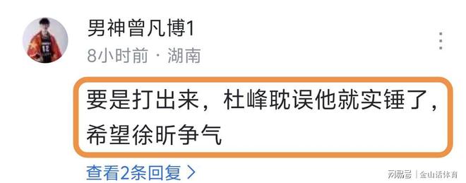 徐昕在“新东家”如鱼得水,也让支持他的网友欣喜万分,纷纷表示“你看看人家”;“遇到恩师了,而不是那种作秀表面一套背后一套的那种教练,好好加油。”;“要是打出来,杜峰耽误他就实锤了,希望徐昕争气”;“徐昕就留在广州好了,也有个好教练帮他”;“碰到好老师,好好跟着学习”……